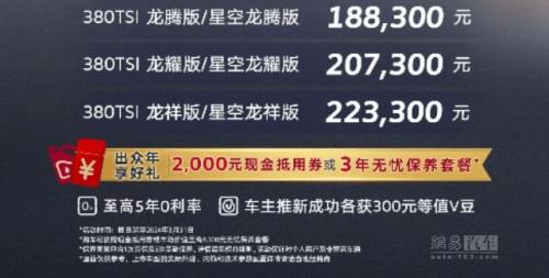 同时,现在购买帕萨特2024出众款,还将享受2,000元现金抵用券或3年无忧保养套餐、至高5年0利率、车主推新成功各获300元等值V豆等购车礼遇。