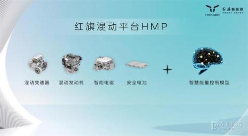 混动平台HMP,可横置或纵置布局,包括混动变速器、发动机、智能电驱及安全电池等核心系统,以及智慧能量控制模型,旨在建立技术领先地位。