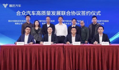 汽车信息网4月17日讯近日,哪吒汽车宣布,桐乡市国有资本投资运营有限公司、宜春市金合股权投资有限公司、南宁民生新能源产业投资合伙企业(有限合伙)三方与合众汽车的代表共同签署《合众汽车高质量发展联合协议》。合众汽车股东单位北京华鼎新动力股权投资基金、成都鸿景科技有限公司、宁波梅山保税港区问鼎投资有限公司的代表共同见证签约。
