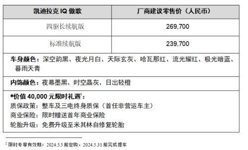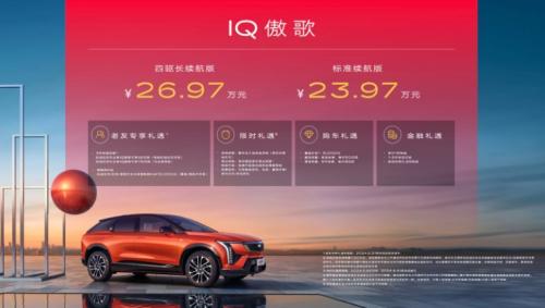 汽车信息网4月25日讯今日,上汽通用汽车凯迪拉克品牌宣布旗下豪华纯电中型SUV——IQ傲歌正式上市。新车提供2种续航里程选择,标准续航版售价239,700元,四驱长续航版269,700元,车主可享包括整车及三电系统终身质保、至高价值10,000元的置换补贴等尊享福利。同时,凯迪拉克此次重磅推出“宠粉福利”,购买IQ傲歌的凯迪拉克车主可享最高8折的3年保值回购*,远超当下所有电车3年保值率,让车主购车无忧。目前,IQ傲歌展车和试驾车已全面到店并即日开启全国交付。用户可下载MyCadillac App支付5,000元定金完成下定,享受丰富的车主权益。