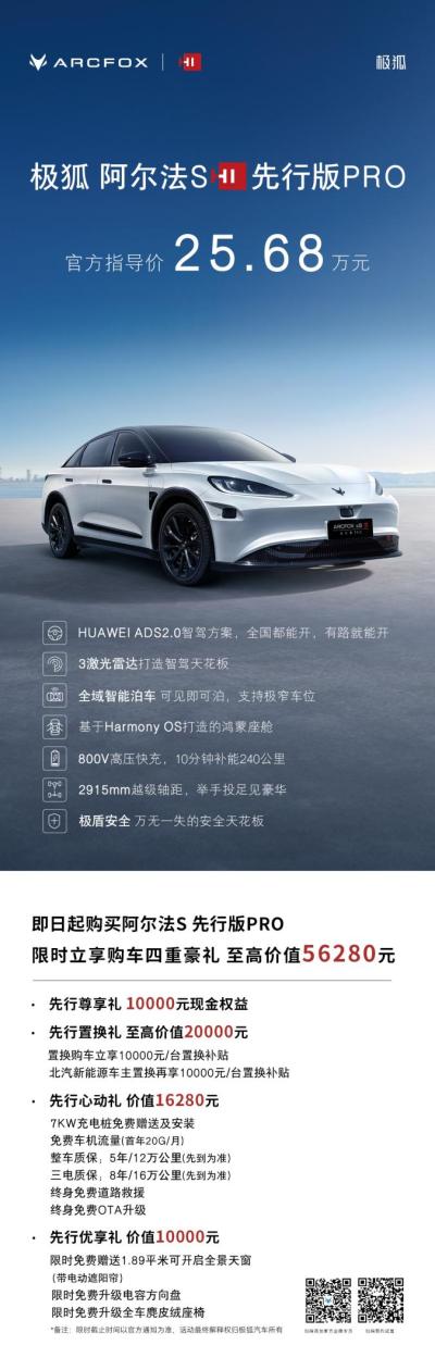 4月25日,极狐阿尔法S先行版PRO在北京车展正式上市,官方指导售价为25.68万元。同时,还限时推出了四重豪礼,综合优惠近56280元,其中现金优惠1万元,这意味着只需24.68万元即可拥有高阶智能豪华纯电轿车,更有置换车主享最高20000元优惠,最低可达22.68万。相较市面上其他带激光雷达的车型基本都在26万以上,这款车可以称之为“最具产品竞争力的高阶智驾产品”。