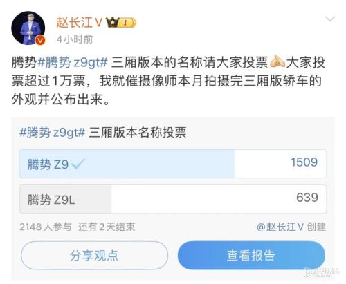 5月8日,腾势销售事业部总经理赵长江在个人社交媒体账号发文表示,请大家为腾势Z9 GT三厢版的名称投票,提供“腾势Z9”和“腾势Z9L”两个名称可投。赵长江还称:“大家投票超过1万票,我就催摄像师本月拍摄完三厢版轿车的外观并公布出来。”截止发稿,已有2148人参与了投票,其中选择“腾势Z9”名称的占大部分,投票人数为1509人,而选择“腾势Z9L”投票人数为639人。