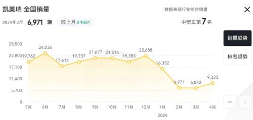 从2024年初开始,凯美瑞销量呈现“断崖式”下滑,特别是2-4月已连续3个月销量未破万了。分析其原因,从竞争对手来看,广汽本田十一代雅阁虽去年5月换代也较为失败,销量一度也很低迷,但靠着官降5万的巨额优惠,销量也赶上来了。