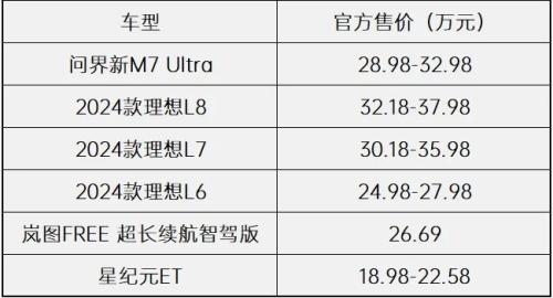 接下来我们把对手集中在理想L7、岚图FREE和星纪元ET身上,看看问界新M7 Ultra的实力,能否扩大领先优势。