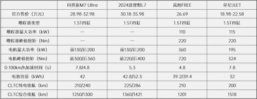 动力部分,从已知参数上看,问界新M7也不是这四款车型里“最猛”的,无论是性能还是续航,都有相同或更出色的车型。不过问界新M7 Ultra同时有后驱和四驱可选,这能让它比星纪元ET有更多选择,同时可以比理想L7更实惠一些。