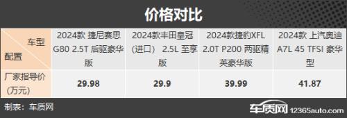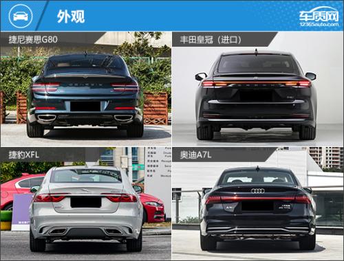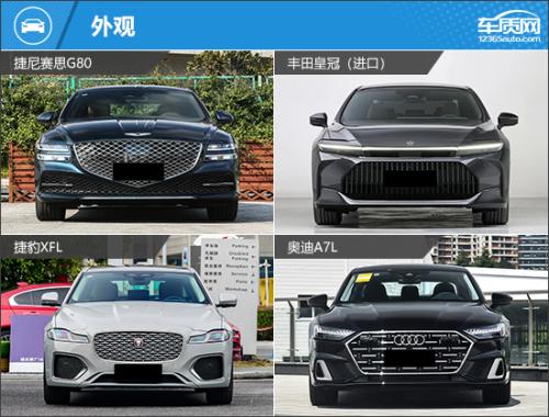 本次挑选的四款车型分别为2024款捷尼赛思G80、2024款丰田皇冠(进口)、2024款捷豹XFL以及2024款上汽奥迪A7L。四款车型均定位豪华中大型轿车,在价格方面,虽然捷豹XFL和上汽奥迪A7L看上去略贵一些,但二者均有着较大的市场终端优惠。(由于目前图片数量较少,因此部分车型的图片并不是相对应的具体款型)