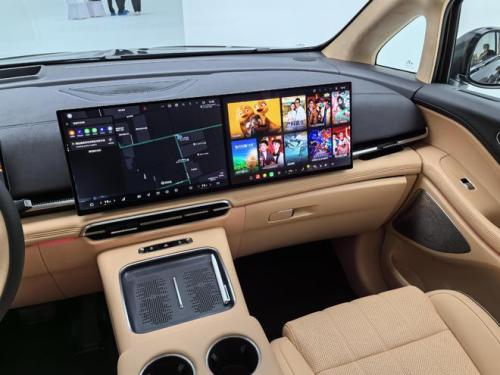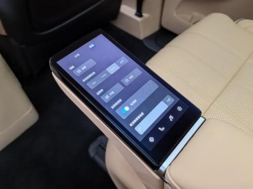 二排座椅侧面扶手还提供了隐藏式杯架,下方置物空间是随手放置手机的插槽,中间的扶手屏类似腾势D9升级版,操作直观,功能强大,界面美观度更高。
