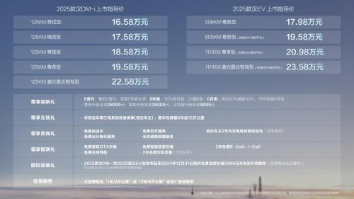 9月9日下午,比亚迪2025款汉DM-i及汉EV正式上市。其中,2025款汉EV共推出4款车型,售价17.98万~23.58万元;2025款汉DM-i共推出5款车型,售价16.58万~22.58万元。