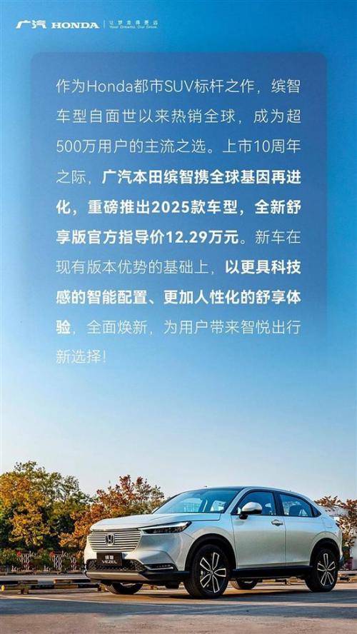日前,广汽本田缤智新增一款“舒享版”车型,新车推出1款车型,售价12.29万元。新车主要针对舒适及科技配置进行了升级,带来更好的用车体验。动力方面,新车搭载1.5L自然吸气发动机,传动系统匹配CVT变速箱。