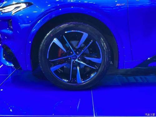 车身侧面,新车采用了双色车身,并营造出隐藏式车顶的效果,整体造型为溜背式的跨界轿跑风格,侧面整体的肌肉感非常明显,搭配双五辐式轮圈以及红色的制动卡钳,进一步提升了新车的运动感。