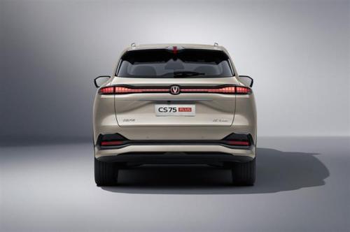 车尾部分,第四代CS75PLUS采用贯穿式后尾灯组设计,内部融入了镀铬饰条与可发光LOGO,兼顾精致感的同时,视觉上更具辨识度。同时,新车车顶末端还配备了小尾翼,并融入了纵置高位刹车灯,视觉效果较为新奇。此外,新车后包围还融入了黑色是吧与红色反光板,使得车尾下部造型不会过于单调。