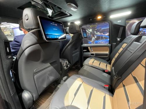 新款AMG G 63提供专属哑光hyper blue车漆,标配全新设计的20英寸5辐AMG轻合金轮圈;提供20-22英寸的6款不同轮圈设计,其中3款轮圈采用双色设计,1款轮圈采用三色设计。还提供全新的碳纤维外观选装组件,深色镀铬格栅、外后视镜罩和车身防护条、后门备胎罩、保险杠和前后下护板均以碳纤维材质包覆。其他组件包括哑光黑色/黑色金属漆备用轮辋,以及前后深色的转向指示灯和车灯。