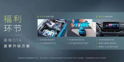 另据悉,除了加推“时空版”新车型,根据前期用户的反馈需求,本次吉利星瑞还带来了OTA夏季升级,公布将于6月15日对FOTA进行升级,其升级内容为车道保持性能优化、HUD增强体验升级、空调温控系统提升、BSD盲区监测显示提升等;同时还将于6月30日对SOTA进行升级,主要升级在车机性能体验升级,新增尊享三星堆主题皮肤和G-Clean控件功能,进一步提升用户的驾乘体验,常用常新。