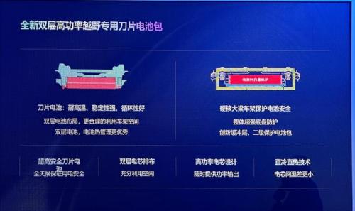 另外,方程豹5搭载了比亚迪看家的刀片电池,不过与此前的布局不同,它采用了和电动悍马(HUMMER EV)一样的电池布局——双层电池。这样的布局可以在有限空间放下更大容量的电池,加上直冷直热技术,电池热管理也更到位。