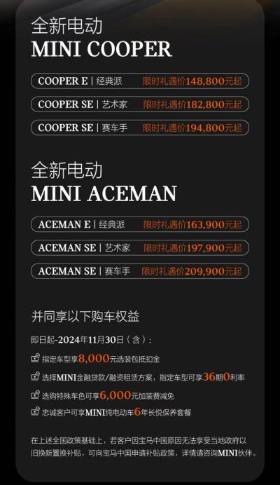 网易汽车10月18日报道日前,我们从官方获悉,从10月18日起,MINI开启限时优惠,全新电动MINI COOPER售14.88万元起,全新电动MINI ACEMAN售16.39万元起。电动MINI COOPER E经典派现在14.88万就能拿,相比之前最高降幅7万!是不是可以重拾那份精致的驾驶乐趣了?值得一提的是,官方并没有背刺老车主,承诺现金差价退还,还是很有诚意的。详情请看小编整理的价格对比。