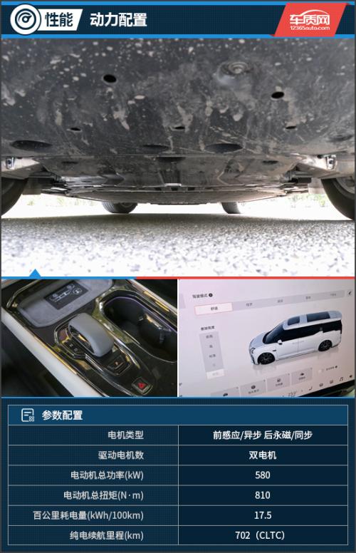 动力方面,评测车的动力参数可以说相当亮眼,电动机总功率580kW,总扭矩810N*m,百公里加速仅需3.9s,CLTC纯电续航里程可达702km。在800V高压架构的加持下,电量SoC10%充至80%仅需11.5分钟,一定程度上能够缓解消费者的补能焦虑。