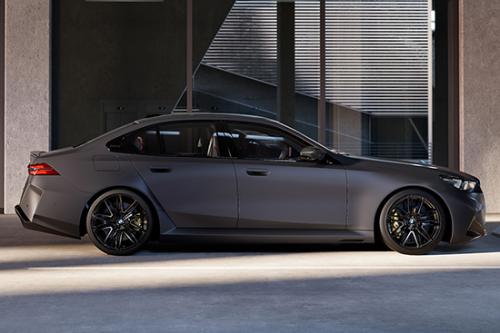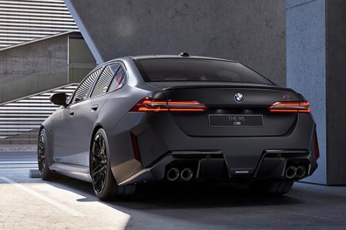 侧面采用碳纤维牛角造型后视镜、黑色高光外观组件、碳纤维车顶等,进一步强化运动特性。相比上一代M5,全新宝马M5车身宽度增加67mm,离地间隙降低18mm,营造出更加低趴的车身姿态。尾部基本延续了现款宝马5系的设计,不过双边共四出的排气以及大尺寸扩散器,使其看上去更加凶狠。