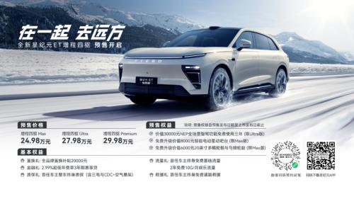 全新星纪元ET增程四驱携诚意而来,上市日24:00前下订锁单,Ultra版用户可免费使用三年价值30000元NEP城市智驾全功能,Max版用户则可免费升级价值6000元20吋多幅轮毂与马牌轮胎及价值8000元星动吧台。尤为值得一提的是,作为“生而国际”的一款车型,全新星纪元ET增程四驱下订用户还有机会亲临现场见证2025年星纪元ET海外上市发布,名额有限,不容错过。