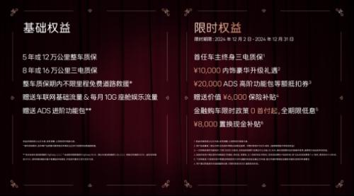 与此同时,针对本次阿维塔11的上市,阿维塔还推出了重磅购车礼遇,2024年12月31日前大定用户可享六大限时权益:首任车主终身三电质保、10000元内饰豪华升级礼遇、20000元ADS高阶功能包等额抵扣券、价值6000元的保险补贴、0首付起全期限低息、8000元置换现金补贴。此外,还可享五大基础权益:5年或12万公里整车质保、8年或16万公里三电质保、整车质保期内不限里程免费道路救援、赠送车联网基础流量和每月10G座舱娱乐流量、赠送ADS进阶功能包。