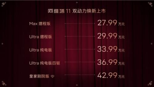 双动力全面焕新,五大天花板成就30万级SUV标杆2024年12月2日(重庆),阿维塔科技宣布,未来智能豪华SUV——阿维塔11正式推出增程车型,纯电车型也全面焕新。新车共两种动力五款车型,官方售价27.99万元起;皇家剧院版售价42.99万元。自此,阿维塔成为了行业唯一一个全系提供增程、纯电双动力选择的高端品牌。即日起,用户可通过阿维塔App、阿维塔官网、阿维塔小程序以及全国各大城市的门店等官方渠道进行订购,上市即交付。