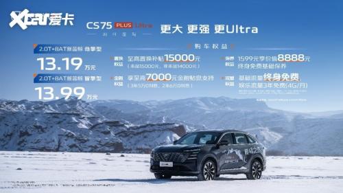 12月24日,长安第四代CS75PLUS Ultra价格及购车权益正式发布。作为长安汽车十年畅销经典车型,此次Ultra版搭载新蓝鲸2.0T高压直喷发动机,标配豪华品牌同平台爱信8AT变速器,共推出2款车型。2.0T+8AT新蓝鲸劲擎型官方指导价13.19万元,2.0T+8AT新蓝鲸智擎型官方指导价13.99万元。