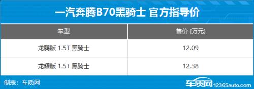 12月24日,一汽奔腾B70黑骑士正式上市。新车整体设计和动力系统没有变化,最大改动在于配备了黑色的外观和内饰套件。此次上市新车共推出两款车型,售价区间为12.09-12.38万元。