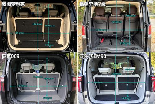 后备厢空间方面,虽然四款车型都或多或少有部分数据并未达到同级别车型测试均值,但是差距基本都在可接受范围内,并不存在明显硬伤。其中,最遗憾的肯定还是福建奔驰V级,无论后备厢开口最大宽度、长度还是垂直高度,都明显优于同级别车型测试均值,唯独后备厢进深一项表现不佳,拖了“后腿”。另外,由于有3项测试都未达到同级别车型测试均值,因此岚图梦想家的整体表现确实稍差一些。
