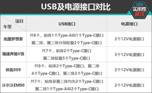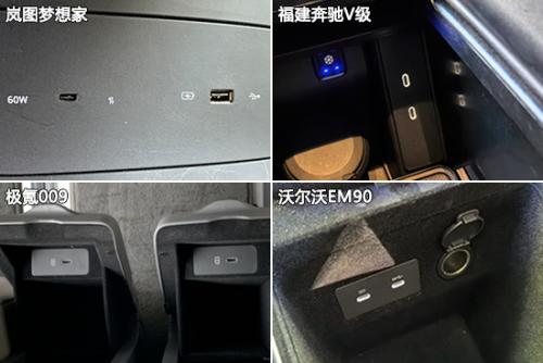 充电接口方面,虽然福建奔驰V的数量并不算少,但是由于其第三排并未配备USB接口,因此实用性表现不如另外三款车型。岚图梦想家和沃尔沃EM90均提供Type-A以及Type-C两种规格接口,适配性更强。对比来看,极氪009的USB接口数量最多,一共有8个,而在12V电源接口数量方面,则是福建奔驰V级略胜一筹。