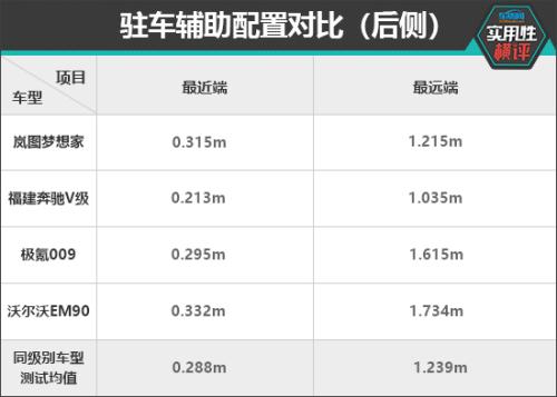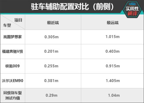 安全配置方面,在前方驻车雷达测试中,沃尔沃EM90的探测能力最强,最远探测距离达到1.405m。在持续蜂鸣阶段,岚图梦想家的测试成绩为0.305m,相较其余三款车型,其与同级别车型测试均值最为相近。