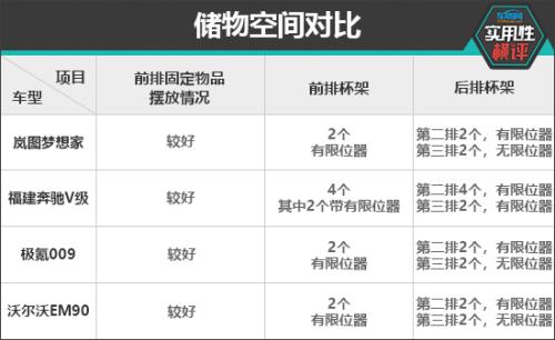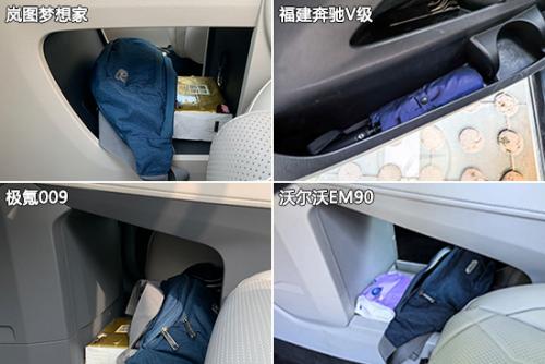 四款车型中,福建奔驰V级和沃尔沃EM90的储物空间(除杯架外)数量最多,总数达到17个;岚图梦想家和极氪009相对较少,共有14个。实测过程中,四款车型均未能提供墨镜专属放置空间,而福建奔驰V级更是连挎包都没有合理的空间摆放,尚存在优化空间。