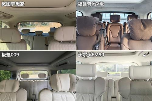 在车内舒适性方面,四款车型的第二排和第三排座椅均配备独立头枕,头部枕靠舒适性良好。值得一提的是,福建奔驰V级的第二排座椅头枕还额外配备了软枕,填充蓬松柔软。虽然岚图梦想家和福建奔驰V级均采用7座布局,但是后者第三排中间座位的乘坐舒适性明显更好。具体来看,福建奔驰V级的第三排不仅采用了独立座椅设计,而且头枕尺寸也没有“缩水”,只是缺少了软枕而已。反观岚图梦想家的第三排座椅,不仅头枕尺寸明显偏小,且中间座位的尺寸和靠背舒适性也都比较一般。