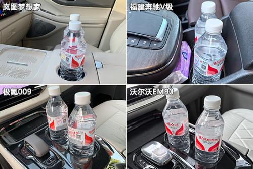 在杯架测试中,福建奔驰V级的前排共配有4个杯架,其中2个带有限位器,数量方面领先另外三款车型。此外,其第二、第三排的杯架数量更是达到了6个,且均配有限位器,整体表现可圈可点。