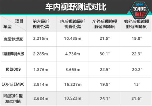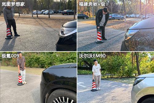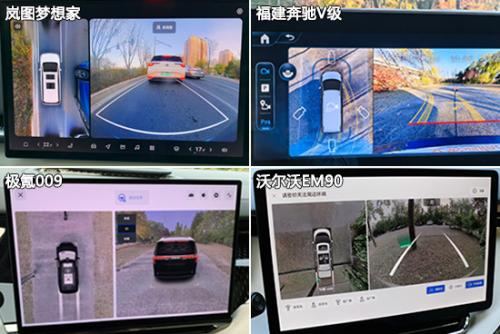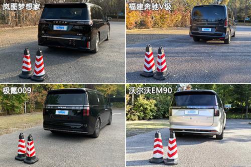 在前方视野测试中,除了沃尔沃EM90之外,其余三款车型的测试成绩均达到同级别车型测试均值。其中,极氪009的表现最好,其前方最近视野距离仅有1.876m。在后方视野测试中,福建奔驰V级和极氪009凭借着流媒体后视镜的加持,测试成绩相较另外两款车型确实具备十分明显的优势。岚图梦想家勉强优于同级别车型测试均值,而沃尔沃EM90则是在该项目中丢分严重。