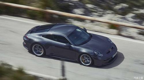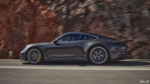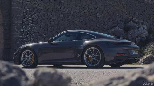 车身侧面,新车保持了保时捷经典的流线型车体,并没有设置一些空力设计,宽大的侧翼子板凸出车身,形成宽体设计,所有的搭配都非常和谐不突兀,看上去非常流畅,让人赏心悦目。再搭配上“Y”型双五辐大尺寸轮圈与碳陶制动系统,让新车的运动感进一步增强。