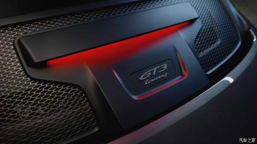 外观方面,新车车头设计与标准版的全新GT3相同,依旧采用贯穿式的散热开口,前包围两侧外八形状的空力造型上还配有横向布局的LED日间行车灯。前机舱盖前端还设有两个空气引流槽,搭配两侧经典的椭圆形大灯组,让新车看上去非常凶悍。