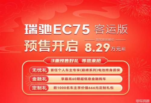 2025年1月16日,瑞驰EC75客运版车型正式下线,同时也正式开启预售。瑞驰EC75客运版共推出了智驾版、智驾超充版、荣耀版和荣耀超充版四个版本,预售价8.29万元起。
