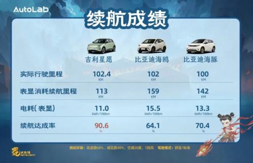 吉利星愿、比亚迪海鸥、比亚迪海豚,三款测试车型,CLTC续航里程分别为410km、405km、420km。