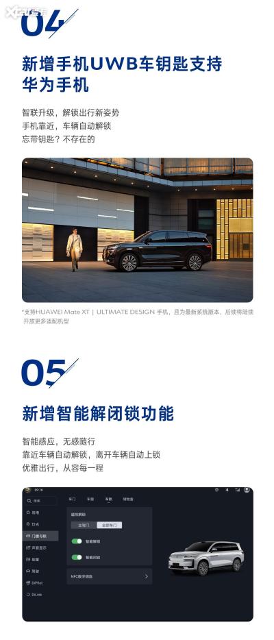 备受好评的手机UWB车钥匙功能,无需实体钥匙,靠近车辆即可解锁,赋予每一次出行满满的仪式感。一位车主在腾势汽车社区分享道:“自从有了手机UWB车钥匙,再也不用担心忘记带钥匙了,真是太方便了!”本次OTA升级手机UWB车钥匙支持华为手机,让华为手机用户也能轻松体验到手机UWB车钥匙的便捷。同时,本次OTA升级还带来智能解闭锁功能,携带实体钥匙靠近车辆,车辆自动解锁,离开车辆自动上锁,让出行更优雅从容。
