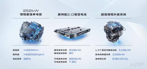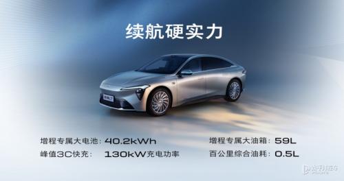 而这次的真龙插混针对增程车型四大痛点进行优化,来为用户提供更为豪华的驾驶体验。首先来看一下这套“真龙”增程系统的技术参数,发动机方面采用了1.5T混动专用发动机,最大输出功率115kW,匹配发电机峰值功率100kW,电机方面则是配备了单电机,其最大功率达到了252kW,峰值扭矩超过400Nm,零百加速成绩为5.8秒。电池方面搭载了一块40.02kWh的电池,充电速度方面最快能够支持120kW快充,30%~80%充电时间为18分钟, CLTC纯电续航里程能够达到302km,综合续航里程能够达到CLTC综合续航能够超过1400km。