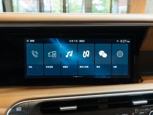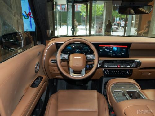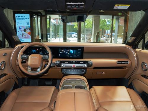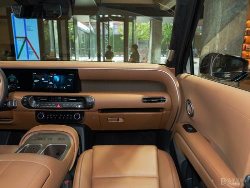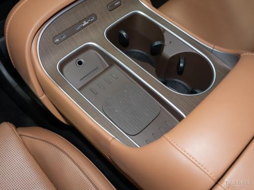 内饰整体采用暖色调,浅棕色真皮内饰搭配上环绕式的曲面中控大屏和巨大的前挡风玻璃,仿佛置身于一艘豪华游艇的驾驶舱内。新车配备了12.3英寸的液晶中控屏和全液晶仪表屏、100W的USB充电口、无线充电、底部收纳空间、双开门中央扶手等配置。