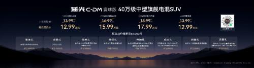 本次上市共有瑶光C-DM寰球版120长续航两驱、210超长续航两驱、200超长续航四驱3款配置版型,指导价分别为13.99万元、16.99万元、18.99万元。新车以40万级豪华品质、40万级豪华安全、40万级豪华性能三大核心优势,重新定义40万级旗舰电混SUV价值标准。同时,星途还为青睐燃油车的消费者提供了燃油版车型瑶光400T寰球版,指导价13.99万元。