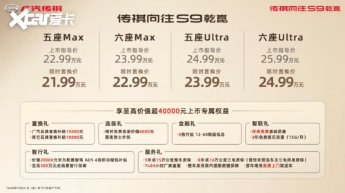 传祺向往S9乾崑上市指导价22.99万元起,可选五六座,满足不同用户购车需求。同时还为用户准备了六大诚意十足的上市礼包,综合价值超40000元。