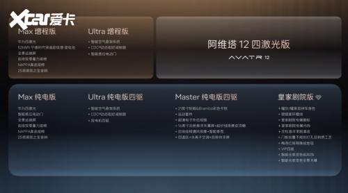阿维塔12四激光版提供纯电与增程双动力,共推出6款车型,以华为四激光雷达、华为乾崑ADS 4、52kWh大容量宁德时代骁遥超级增·混电池为代表的“十项全新升级”,以及英国之宝25扬声器音响、VIP四座豪华包、四温区空调与纳米水离子健康氧颜舱等“十二项同级独享”配置,共同铸就新豪华出行体验,重新定义了30万级豪华轿车标准。