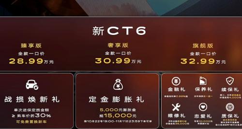 新CT6共规划三款配置车型,限时一口价28.99万-32.99万元,较指导价下调了8万-10万元。三款车型标配MRC电磁悬挂、360度全景影像、L2级辅助驾驶系统、33英寸9K环幕屏等。
