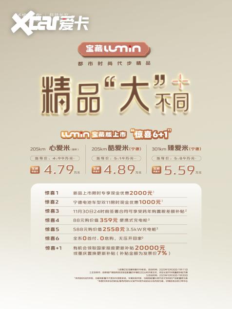 此次Lumin宝藏版上市,共推出心爱米、酷爱米、臻爱米三个配置,从命名上就可以感到“少女味儿”很浓,而且官方惊喜价只要4.79万~5.59万元,基本就是几部iPhone的价格了。同时此次同步推出“惊喜6+1”大礼,让购车门槛更低。