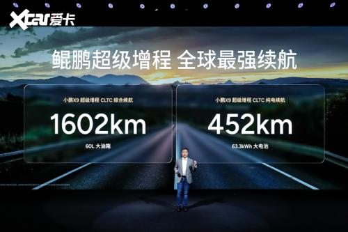 首款搭载鲲鹏超级增程技术的车型——小鹏X9超级增程,配备63.3kWh超快充磷酸铁锂大电池+60L大油箱,实现CLTC纯电续航452km、CLTC综合续航1602km的领先水平,是全球纯电以及综合续航最长的大七座车型。