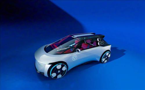 外观部分,概念车车身设计紧凑,上部为透明座舱设计,车侧配备了两个鸥翼门,轮毂使用3D打印生产,材料为再生塑料,并且车上的很多组件都很容易更换,增加使用寿命。