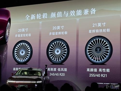 车身侧面,新款享界S9依旧采用溜背式造型,整车非常修长优雅,配备隐藏式门把手,新增20英寸多辐星炫轮毂(选装6000元),搭配米其林轮胎,轮胎规格为245/45 R20。同时,还提供20英寸多辐星辉轮毂(免费)和21英寸星辉锻造轮毂(选装15000元)可选,后者轮胎规格为255/40 R21。此外,新车还提供电子外后视镜选装(价格为10000元,仅限Ultra版车型)。