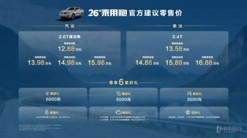 2026款商用炮用户可享6000元现金礼、5000元置换礼、3000元老友礼以及金融礼、服务礼五重大礼;2026款乘用炮可享受6000元现金礼、5000元置换礼、3000元老友礼以及金融礼、服务礼、互联礼六重大礼;2026款越野炮用户则可享10000元现金礼、10000元置换礼、5000元老友礼以及金融礼、服务礼、互联礼六重大礼。