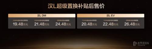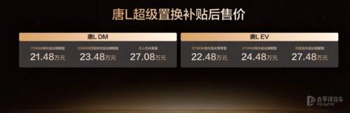 【太平洋汽车新车频道】比亚迪在2025广州车展上,官方公布了汉L/唐L的限时置换补贴价。其中汉L EV 3款车型,超级置换补贴后售价20.48-26.48万元;汉L DM 3款车型,超级置换补贴后售价19.48-24.48万元;唐L EV 3款车型,超级置换补贴后售价22.48-27.48万元;唐L DM 3款车型,超级置换补贴后售价21.48-27.08万元,该价格权益截至12月31日。